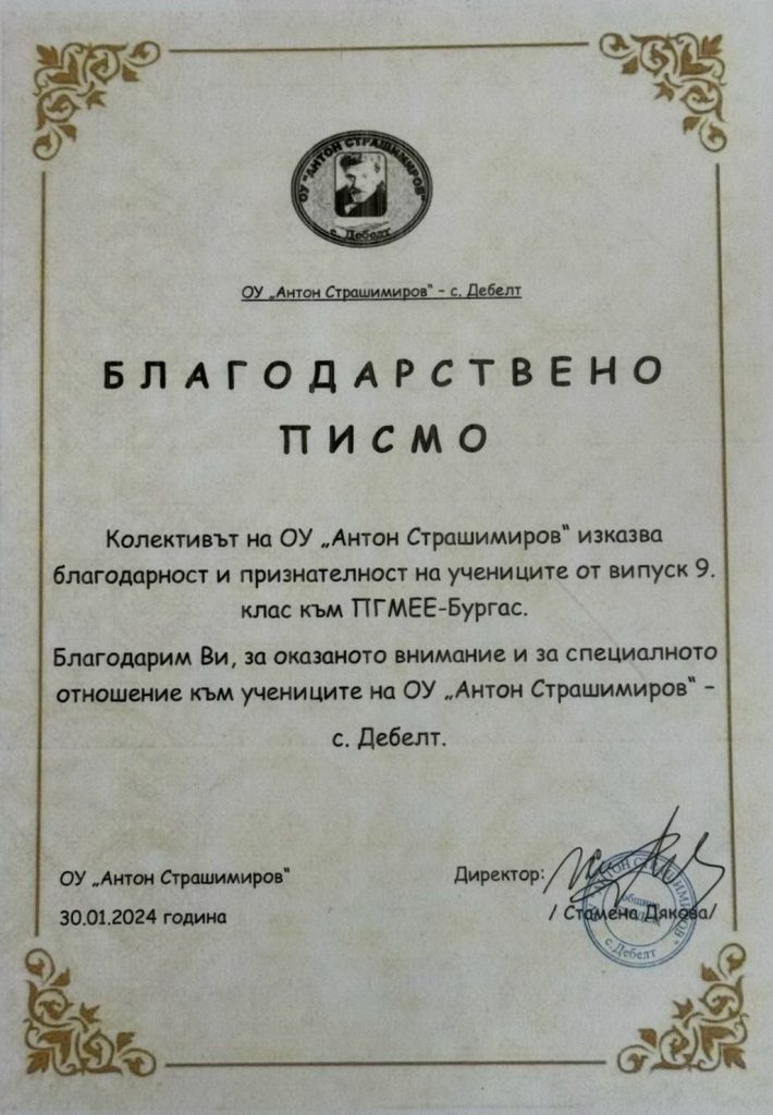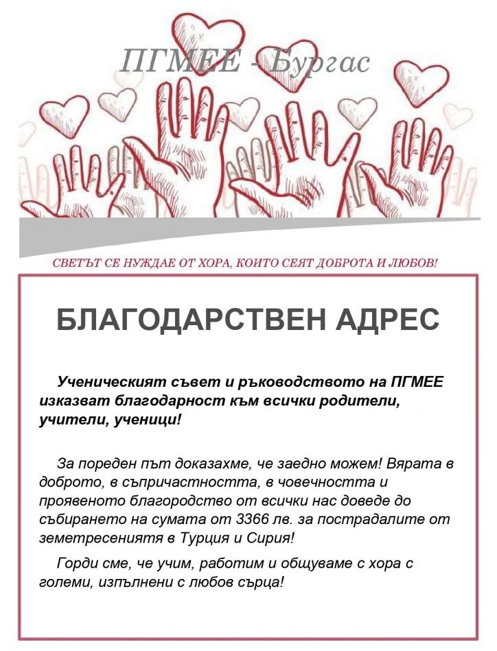 Благотворителна акция,организирана от УС на ПГМЕЕ за пострадалите при земетресенията в Турция и Сирия