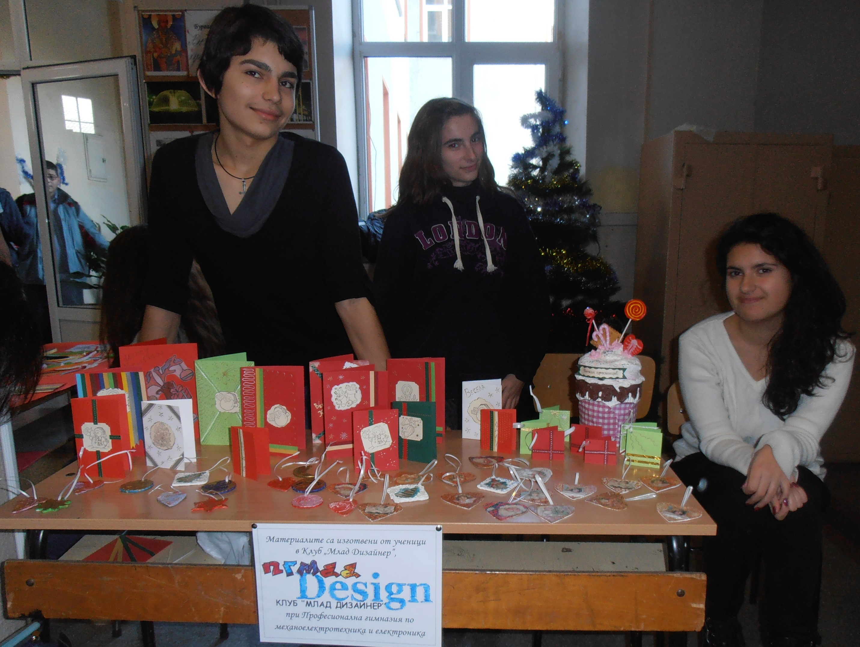 Kлуб ‘’Млад дизайнер’’ ПГМЕЕ с ръководител Зл.Тренчева организираха благотворителен Коледен базар. Учениците бяха изработили декоративни картички, сувенири и коледни украшения.