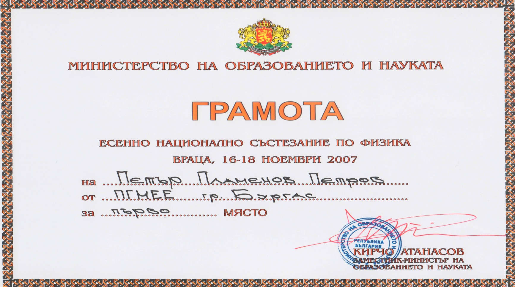 Николай Колев 9 б клас - Първо място на VIII Национална ученическа конференция „Пространство и време“- ВТУ