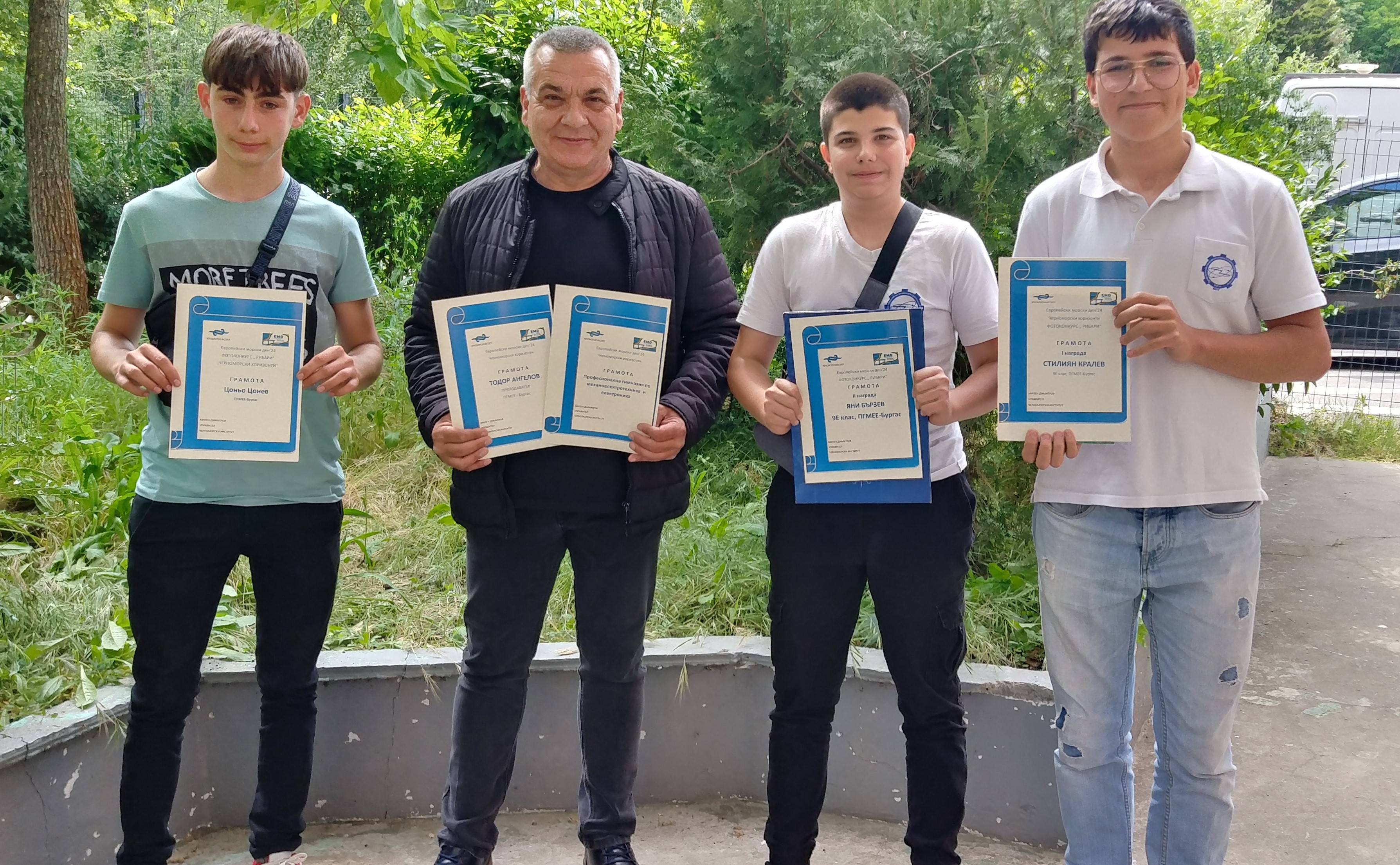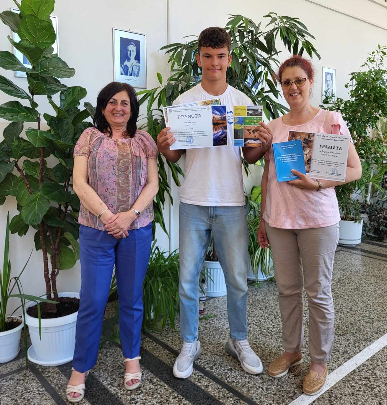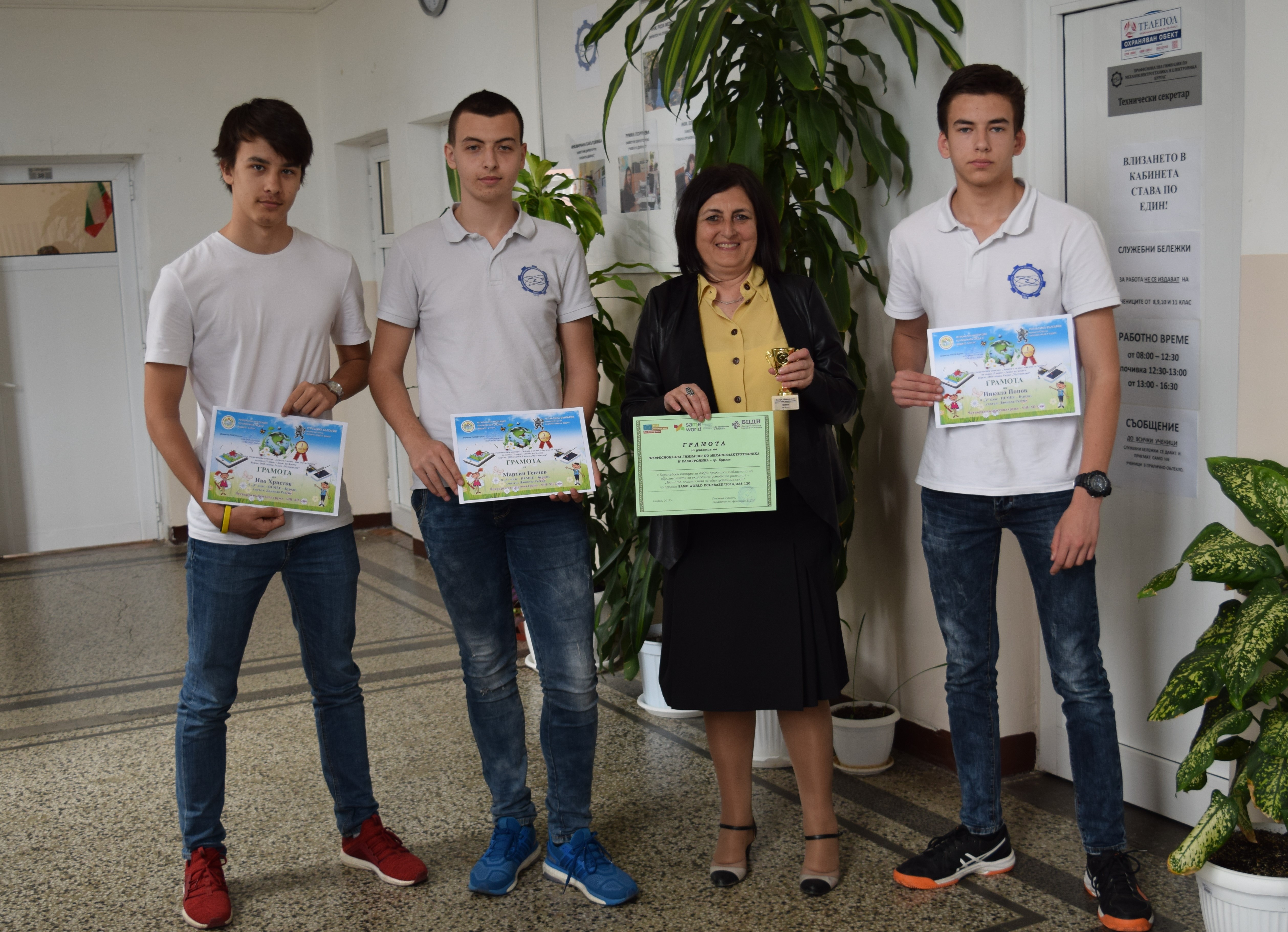 Йордан Бахчеванов и Кристиян Георгиев от 9Ж клас, спечелиха Първо място във II-ри РЕГИОНАЛЕН КОНКУРС „Водата и Земята“. Младежите са членове на клуб „Електронна вселена” с ръководител инж. Диана Илиева. Те участваха в 4-та възрастова група (от VIII – XII клас), раздел Приложно творчество с електронни светещи творби със сензори за движение. На 22.04.2019 год. получиха заслужено Първо място с медали и грамоти за упорита си работа. Светещите картини очароваха всички присъстващи в залата за награждаване!