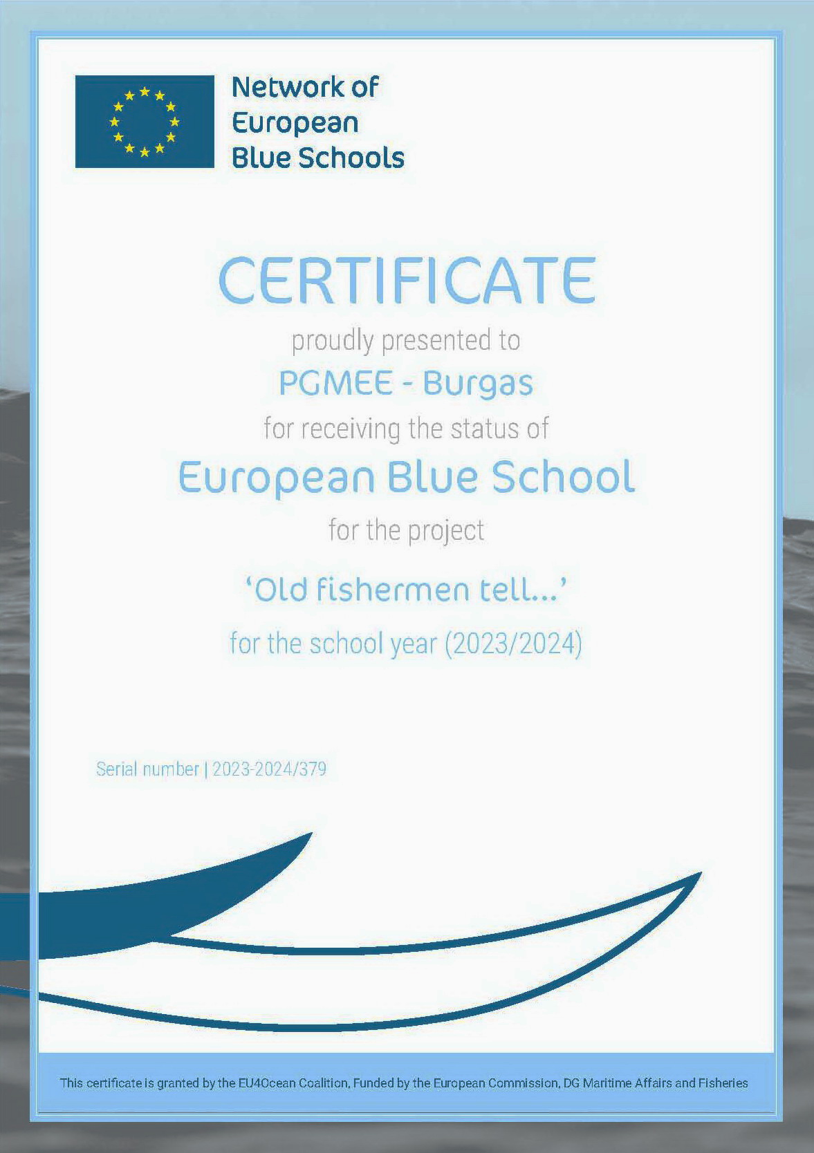 Чрез тази общност, ПГМЕЕ има достъп до ресурси и дейности от потенциални партньори в платформата EU4Ocean. Приемането на Механото за пълноправен член на тази общност е признание за проекта „Старите рибари разказват…“. В общността има над 400 образователни институции от цяла Европа. Мрежата от европейски сини училища е инициатива на Европейската комисия, подкрепена от DG MARE и е разработена от партньорите на коалицията EU4Ocean. В нея членуват училища, които разработват проекти, свързани с моретата и океаните на Европа.