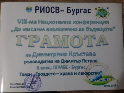 Учениците Димитър Петров и Божидар Славов от 8. клас подготвиха тематични презентации, които споделиха пред участниците в конференцията, и разкриха с интересен и научно обоснован подход своите знания в областта на екологията. Специалната награда на РИОСВ – гр. Бургас спечели Димитър Петров с научната тема: „Гроздето – храна и лекарство“ а единственият награден учител бе госпожа Димитрина Кръстева – ръководител на двамата ученици. Тази награда е признание за усилията и отношението на учениците към научната сфера, както и за значимостта на екологичните въпроси, които ги вълнуват.