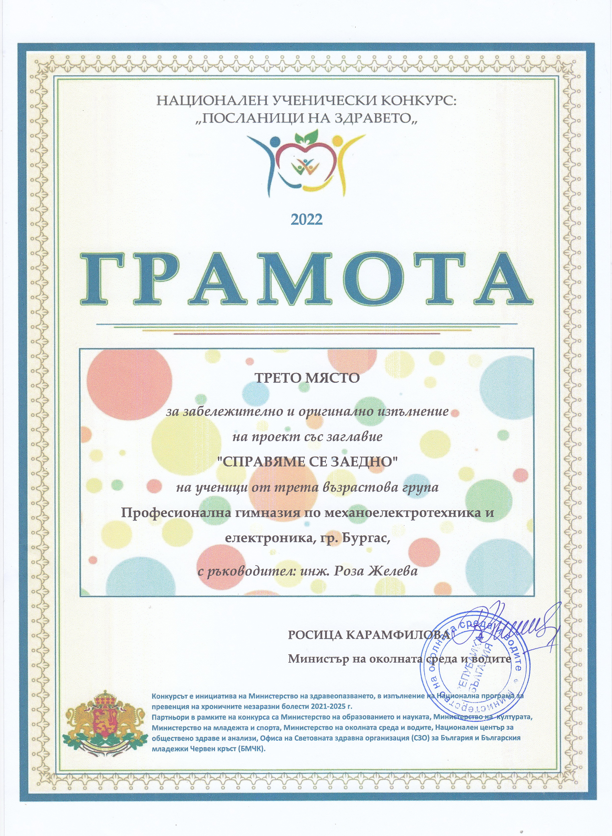 Наградата беше връчена лично от Кирил Ананиев – Министър на здравеопазването, на Ивайло Марио Костов и Димитър Иванов – представители на учениците от VIII класове, реализирали проекта с подкрепата на класните ръководители Д.Живкова, Н.Николова, Д.Митев, Р.Славова, Св.Люцканов, Б.Кафалова, Т.Стайкова и Даниела Русева – учител по биология, М.Водев, М.Иванова – учители по ФВС.