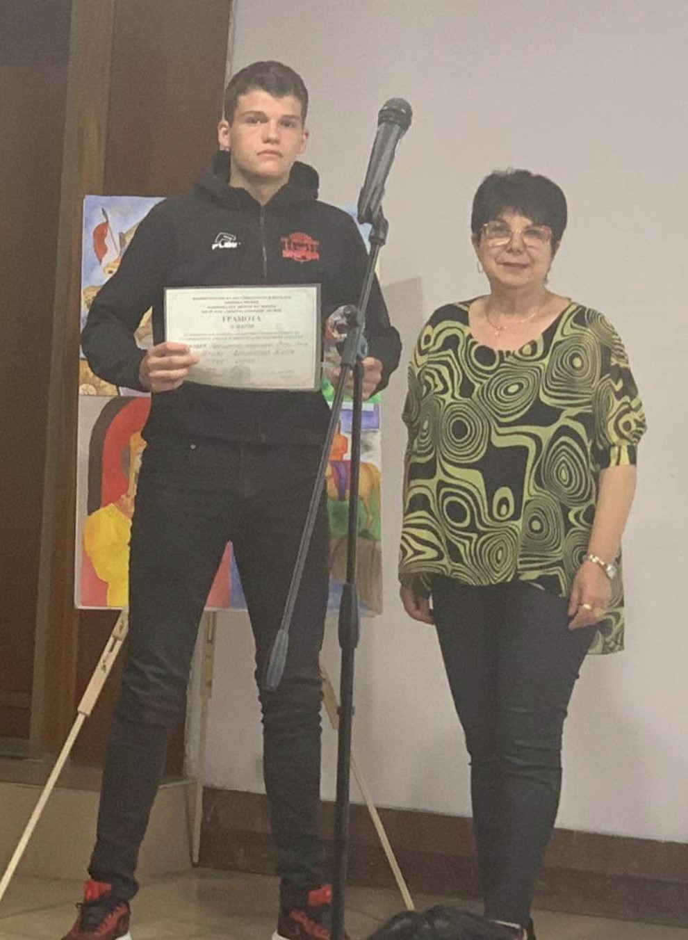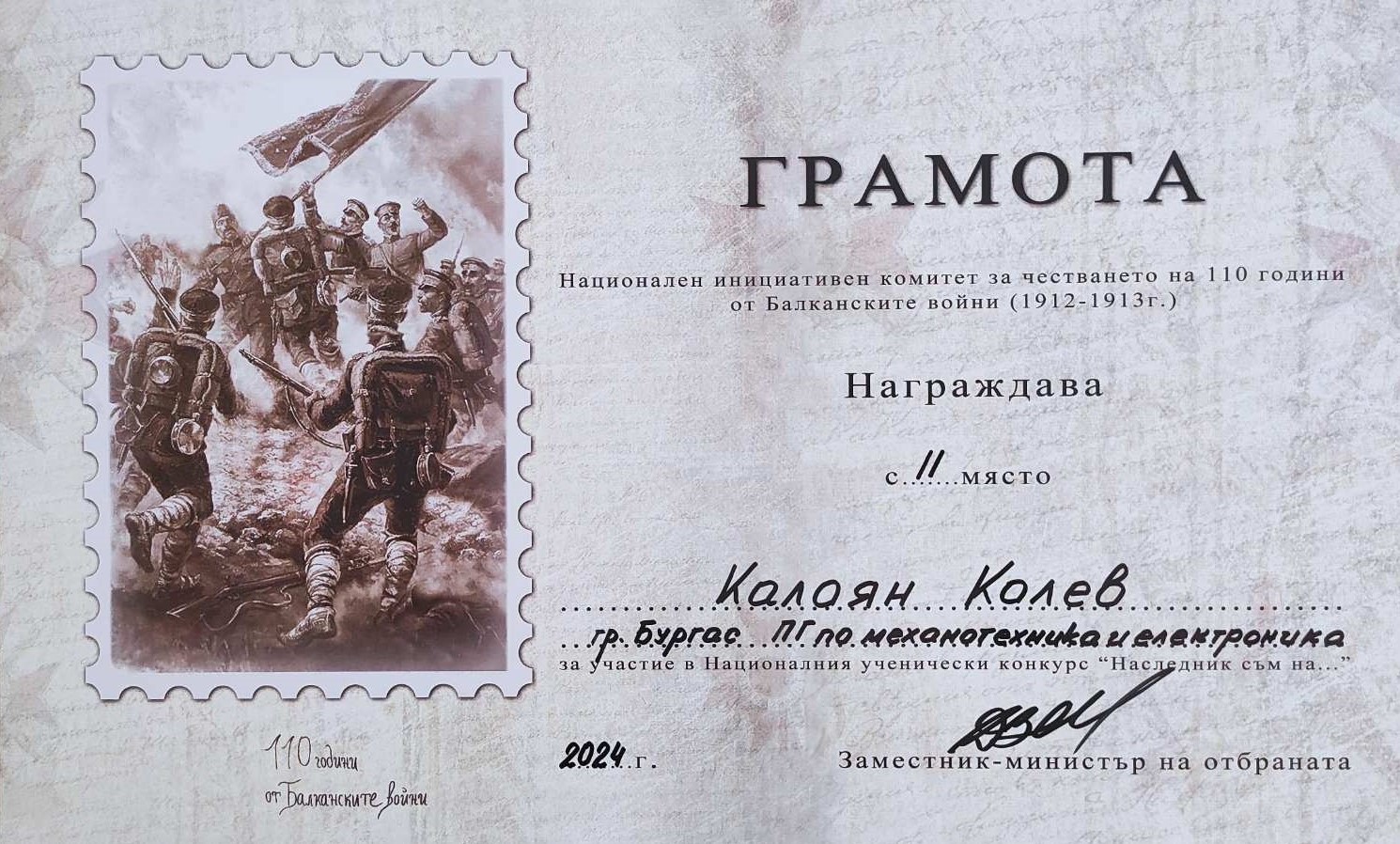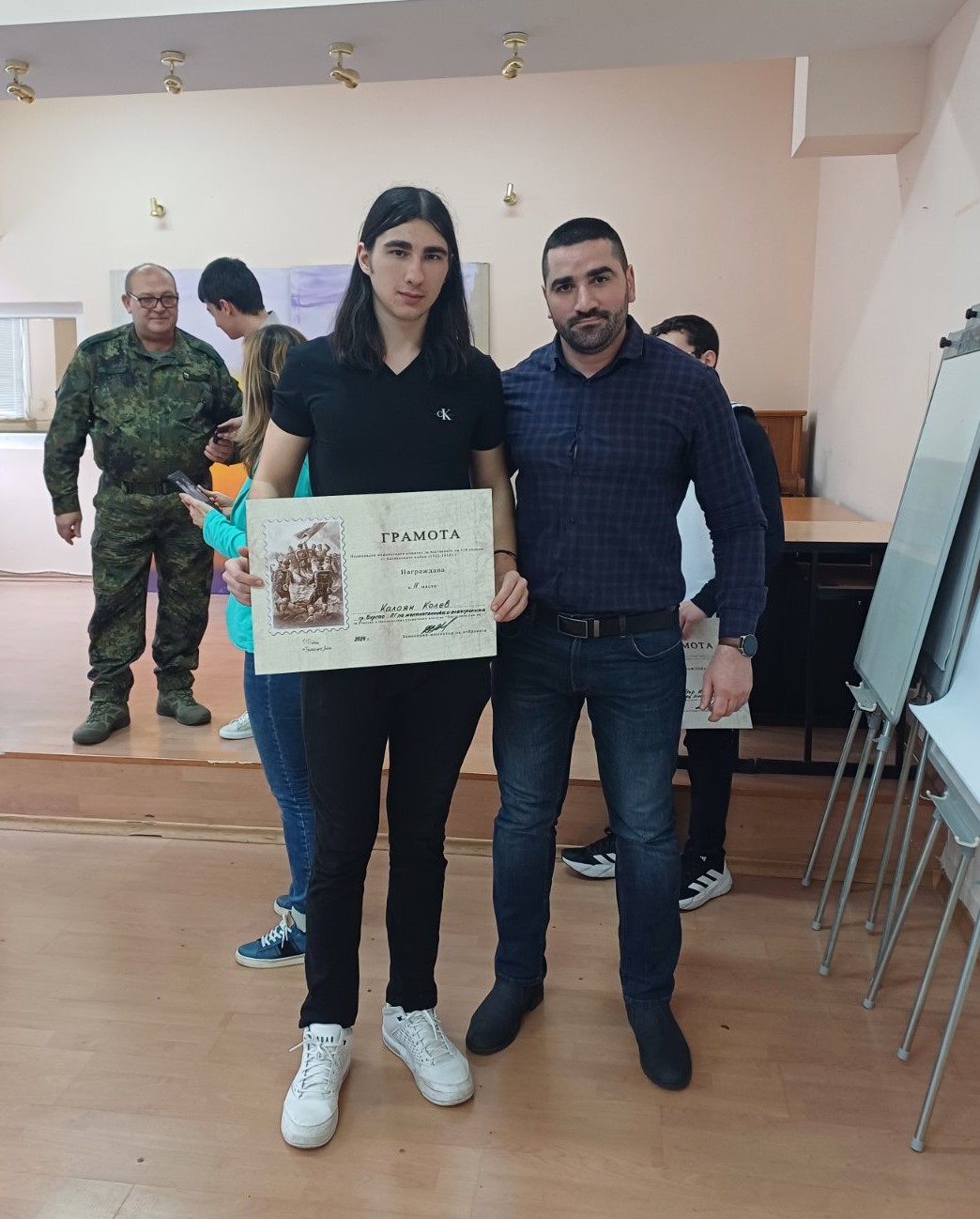 13.03.2024 Участие на ПГМЕЕ в Националния ученически конкурс "Наследник съм на...", организиран от Министерство на отбраната, Централно военно окръжие и Съюзът на ветераните от войните на България. Калоян Колев от 11 И клас заслужи второ място.
