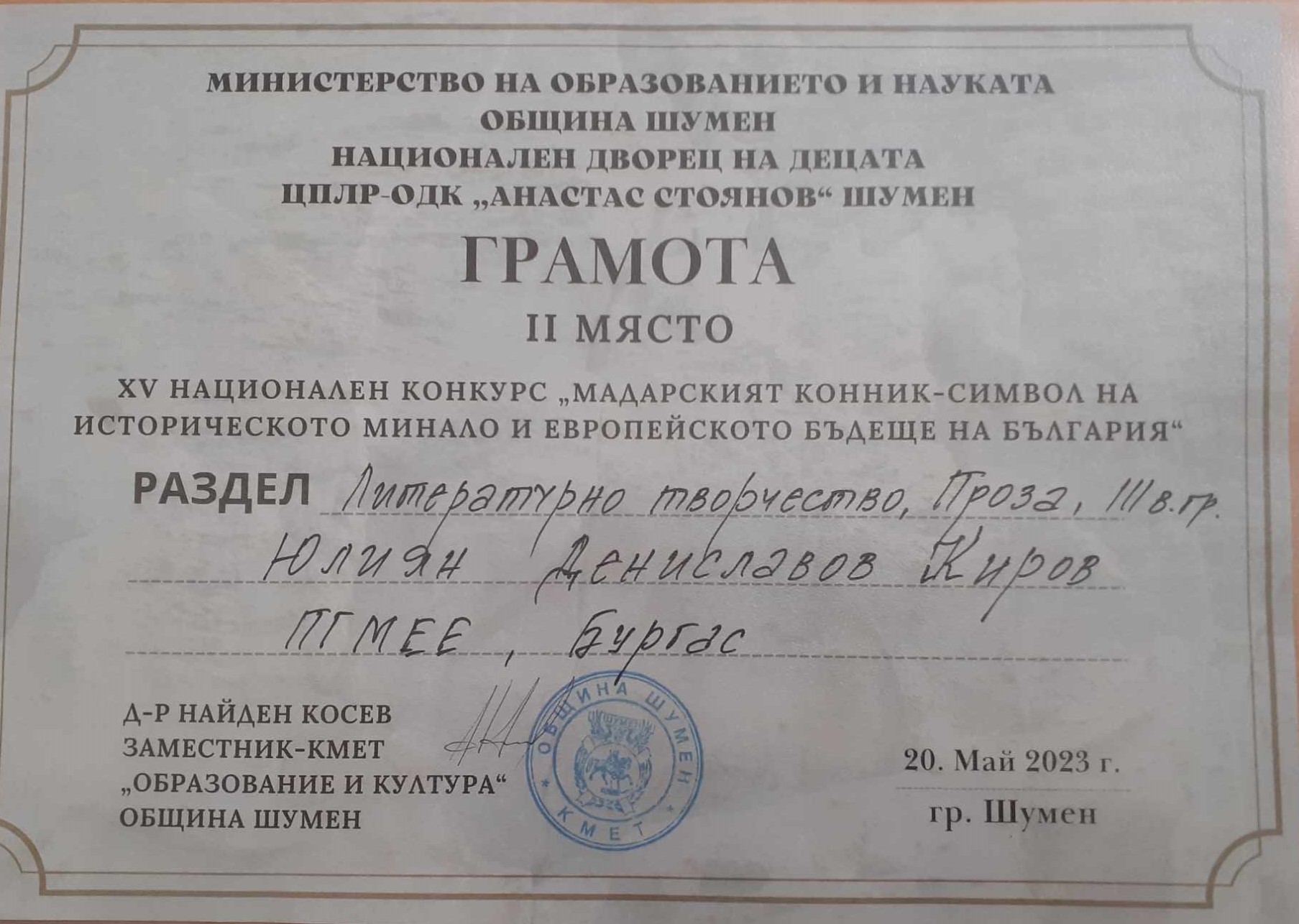Национален конкурс „Мадарски конник - Символ на историческото минало и европейското бъдеще на България“- II място Юлиан Киров 10з клас.