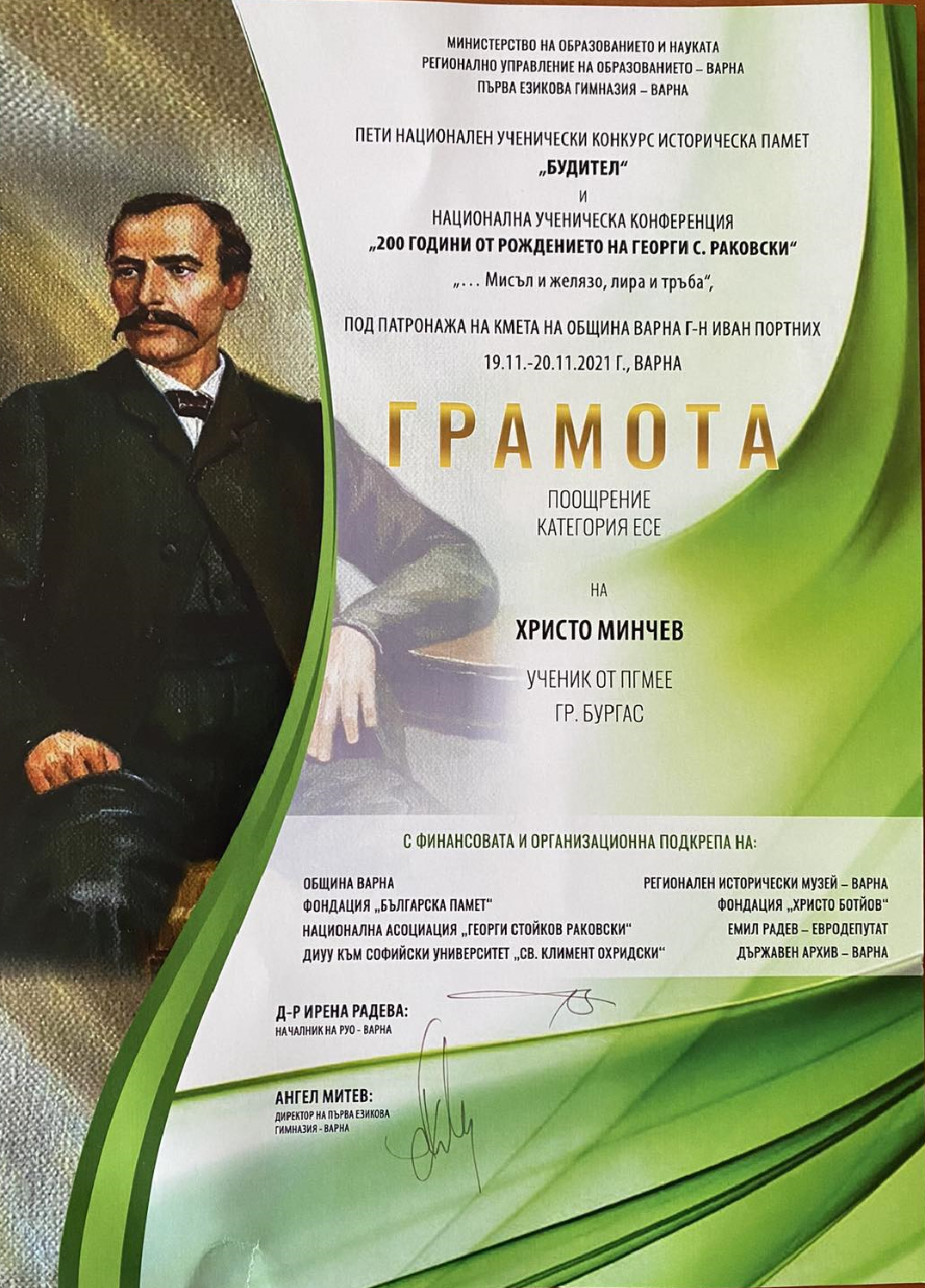 19.11-20.11.2021г година ПГМЕЕ – гр. Бургас взе участие в Пети национален ученически конкурс за историческа памет „Будител“ и в Национална ученическа конференция „200 години от рождението на Георги С. Раковски“ „…Мисъл и желязо, лира и тръба“ под патронажа на кмета на община Варна господин Иван Портних. От общо 250 участници от цялата страна, ученикът Христо Минчев от 10 „ а“ клас успя да се класира сред 8-те най-добри в категория „ЕСЕ“ и бе удостоен с грамота .Той показа изследователски умения , вникване в дълбочината на материята и добра аргументация , за да пресъздаде през своя поглед образа на великия Георги Раковски-идеологът на българското националноосвободително движение. Ръководител на ученика е г-н Светозар Люцканов - учител по история и цивилизации в гимназията.