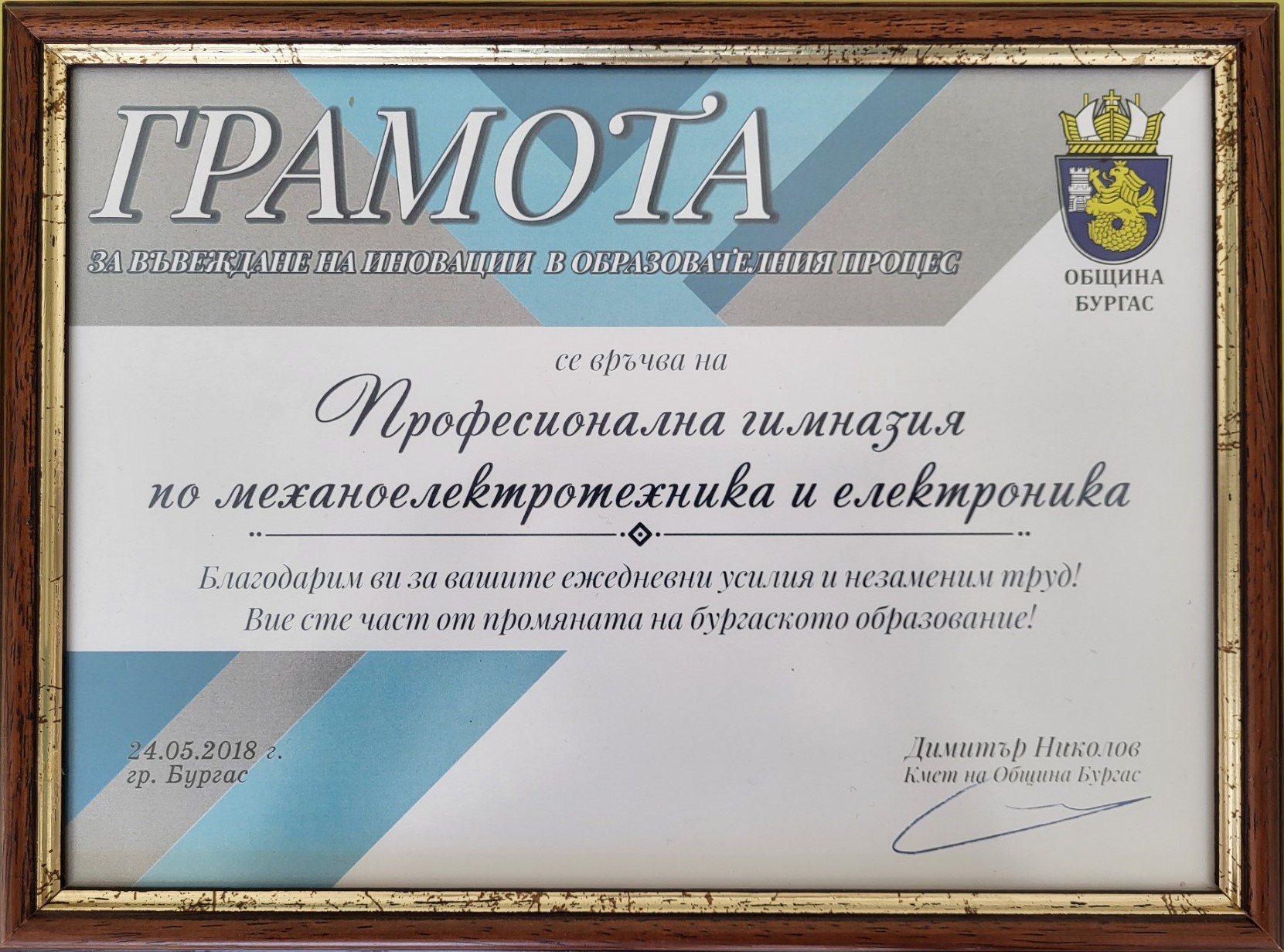 ПЛАКЕТ И ГРАМОТА ЗА ПГМЕЕ ОТ КМЕТА НА ГРАД БУРГАС - ДИМИТЪР НИКОЛОВ ЗА ВЪВЕЖДАНЕ НА ИНОВАЦИИ В ОБРАЗОВАТЕЛНИЯ ПРОЦЕС
