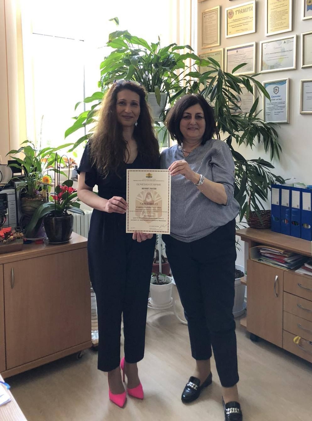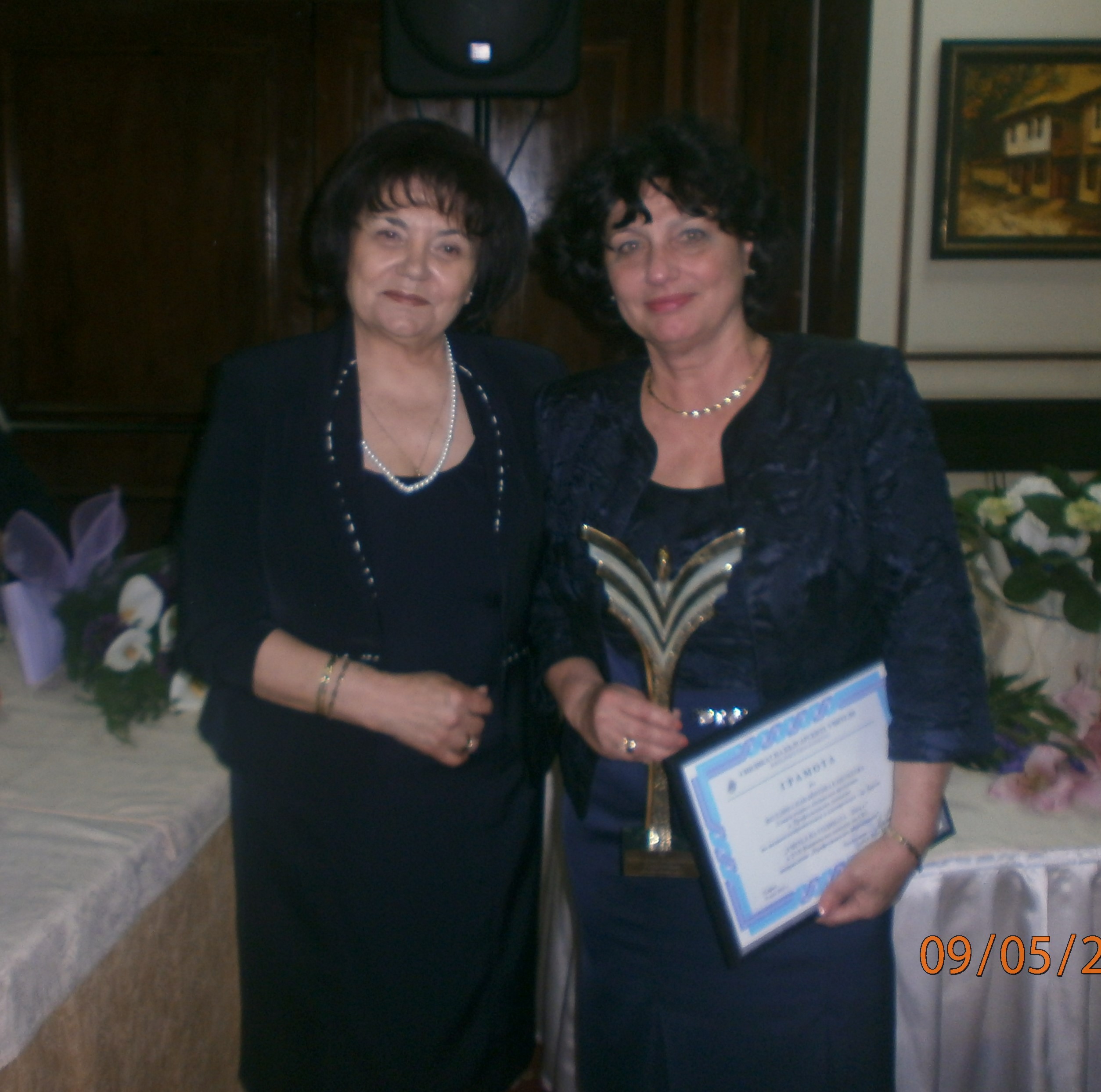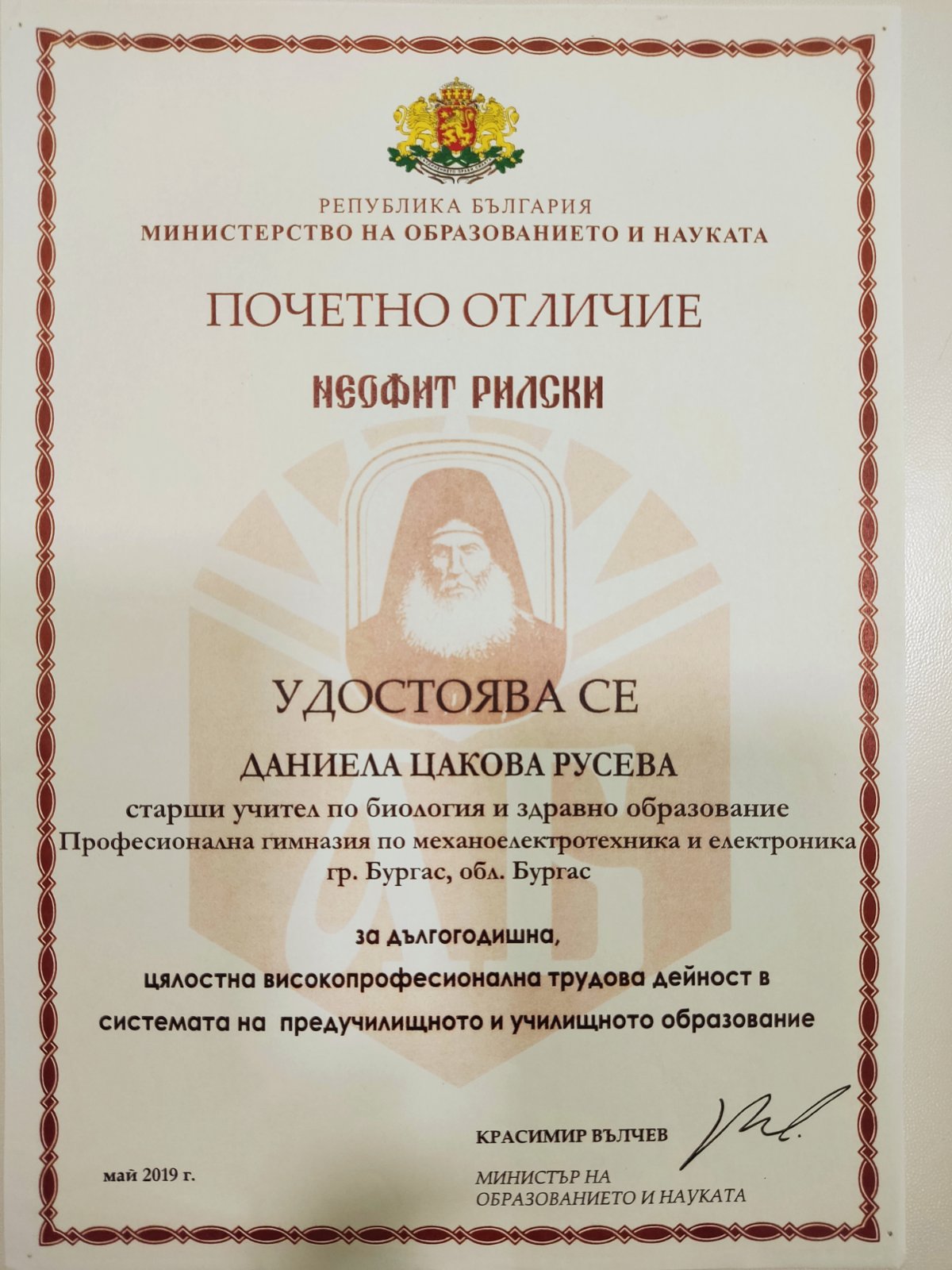На приема за 24 май г-жа Виолета Илиева – началник на РУО Бургас, връчва почетното отличие на МОН – “Неофит Рилски” за цялостна дейност на г-жа Даниела Русева, учител по биология в нашето училище.
