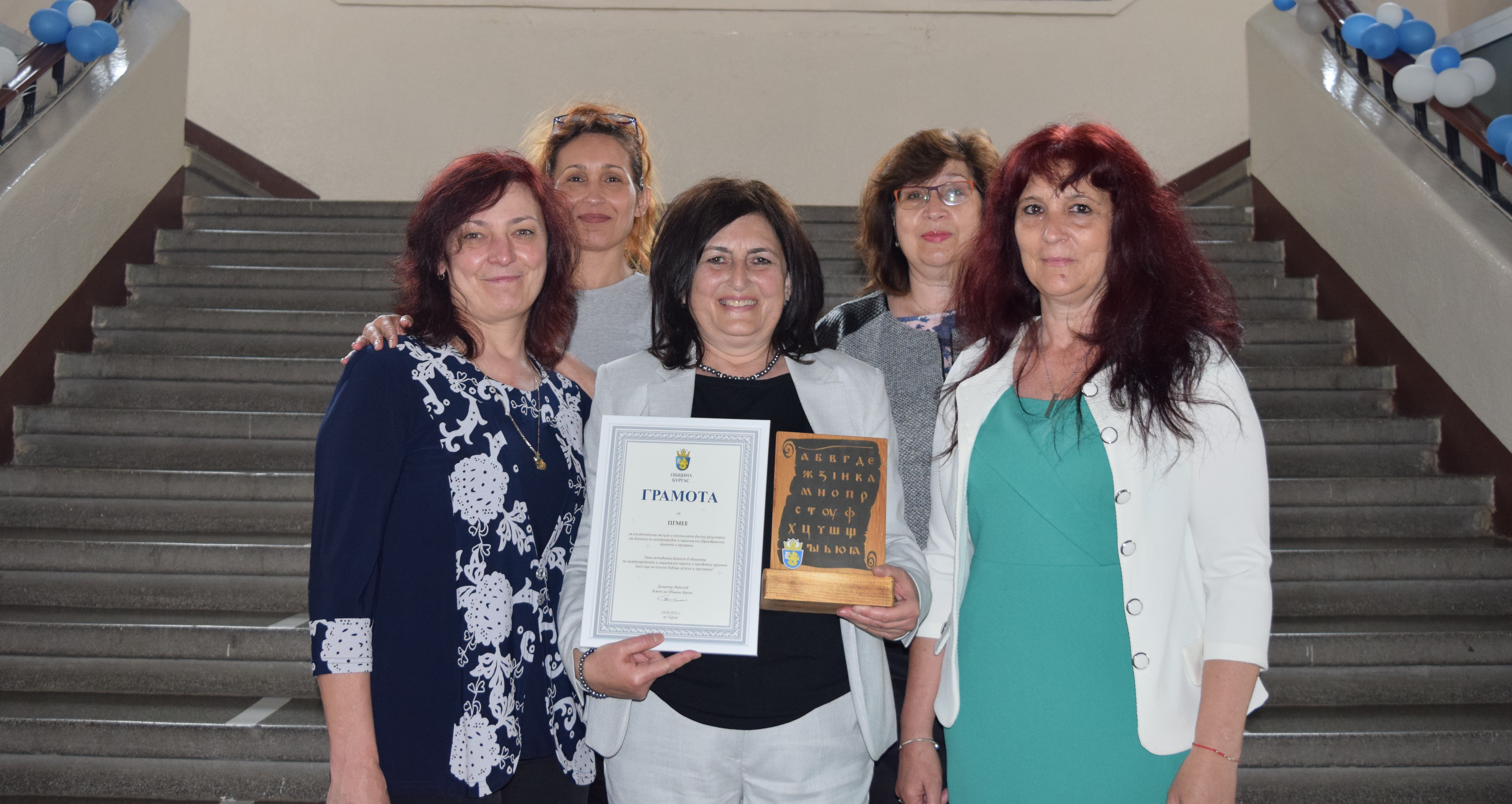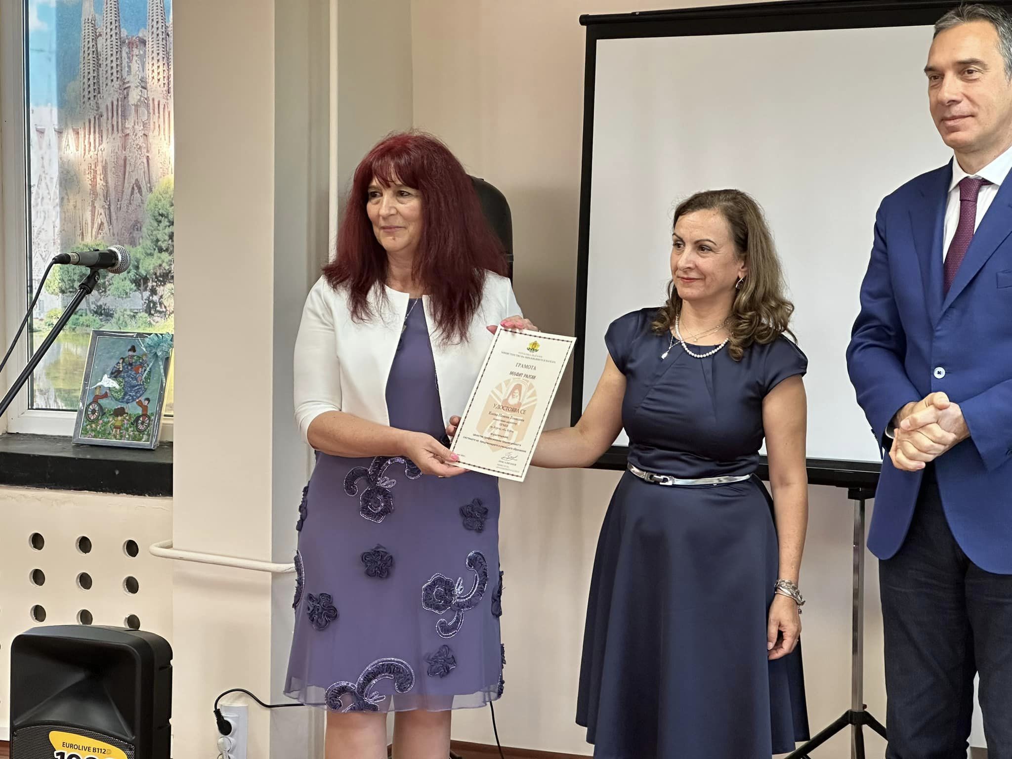 Номинирана единодушно от целия колектив на ПГМЕЕ, инж. Елена Томицина получи Наградата на МОН- “Неофит Рилски” за доказан висок професионализъм и всеотдайност в педагогическата дейност и за постигнати значими резултати в процеса на обучението.