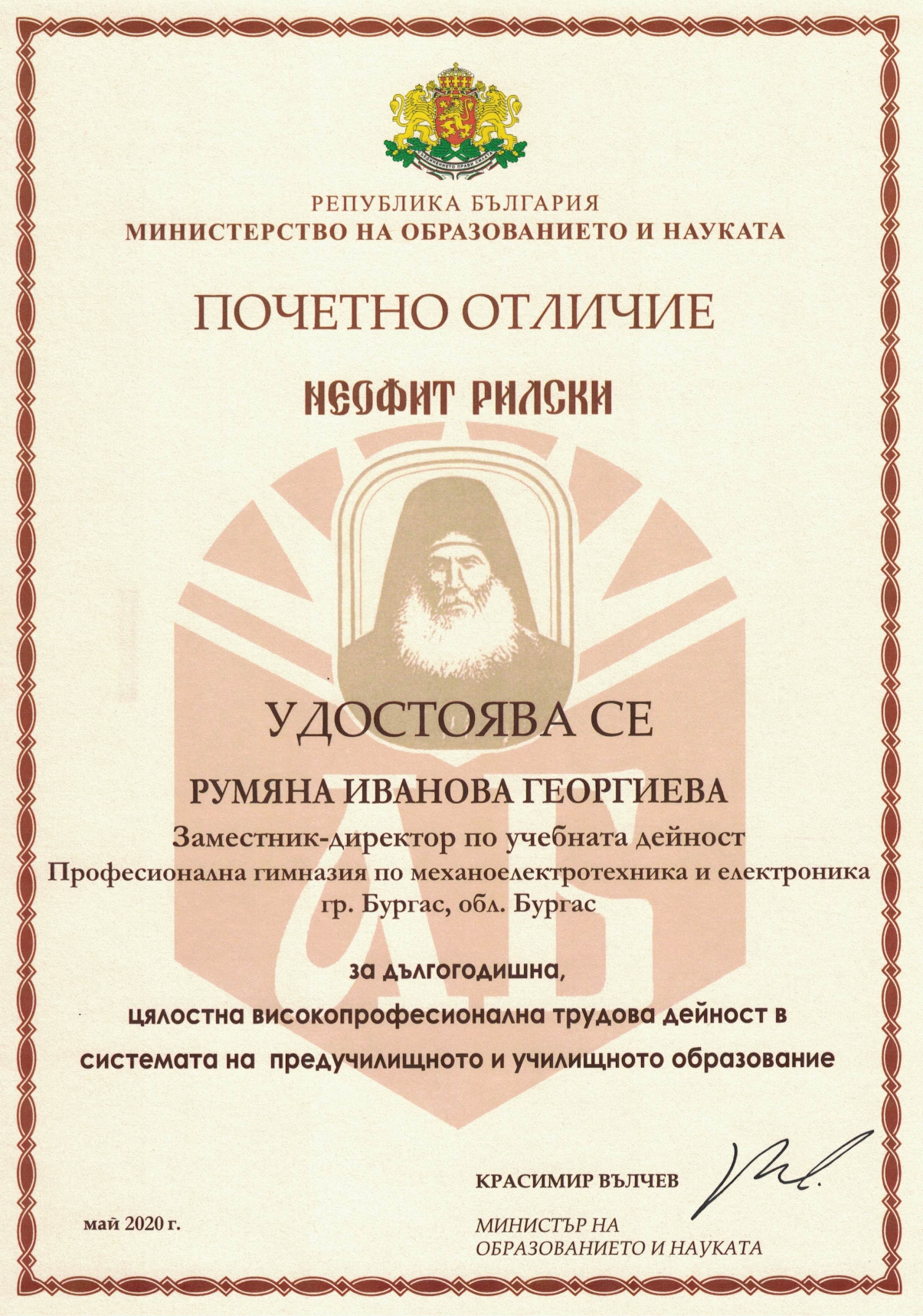 През 2019/20 учебна година по повод най-българския празник – 24 май, ПГМЕЕ отново има свой лауреат на почетното отличие на МОН – “Неофит Рилски” – Румяна Георгиева, зам.-директор УД. То е връчено за дългогодишна, цялостна високопрофесионална трудова дейност в системата на предучилищното и училищното образование.